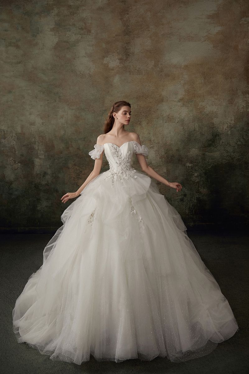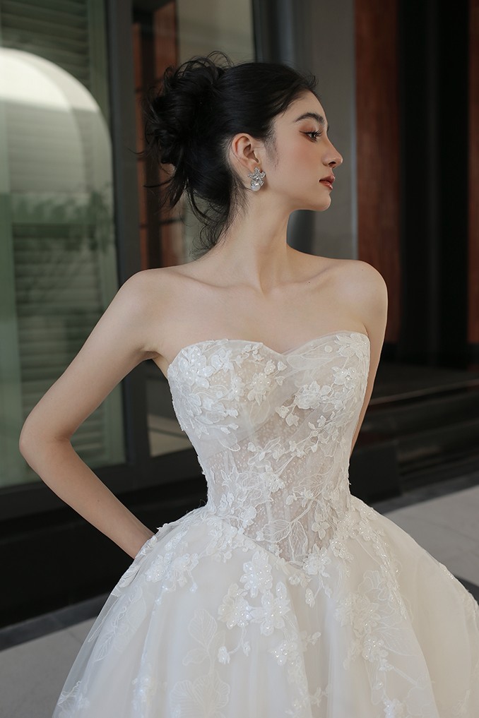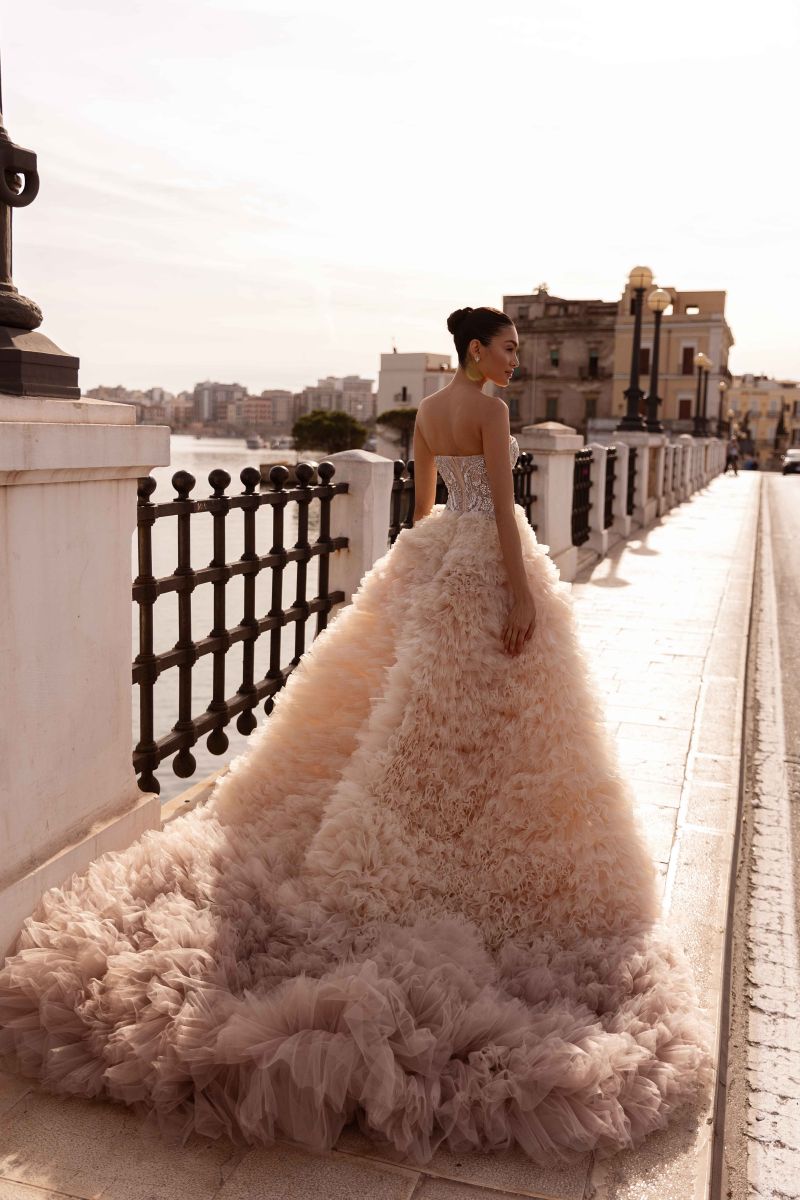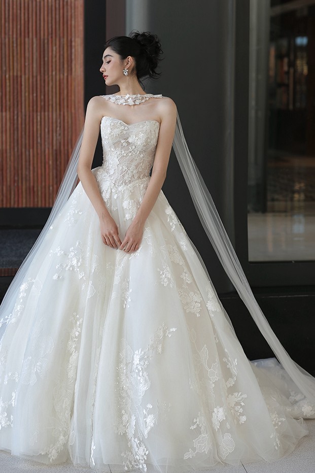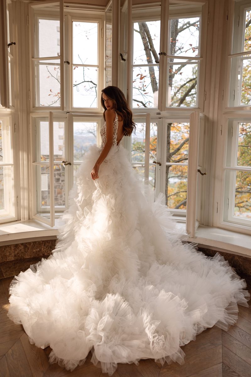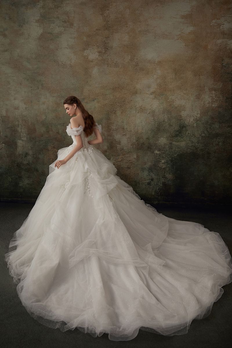 長拖尾澎裙以多層紗料堆疊,透過立裁精準建構裙身輪廓。