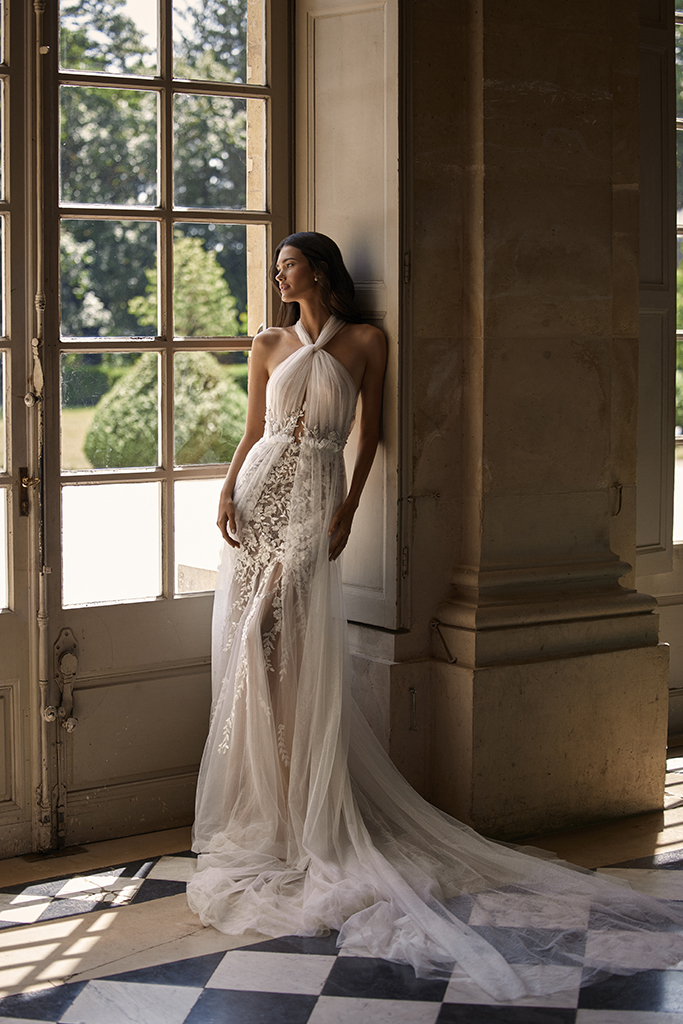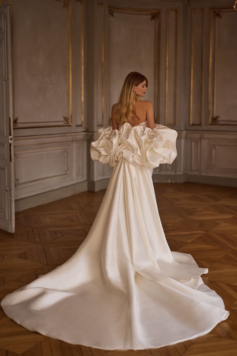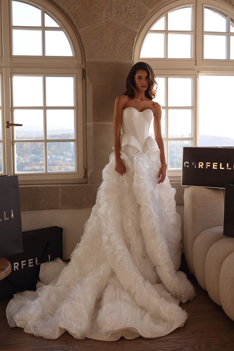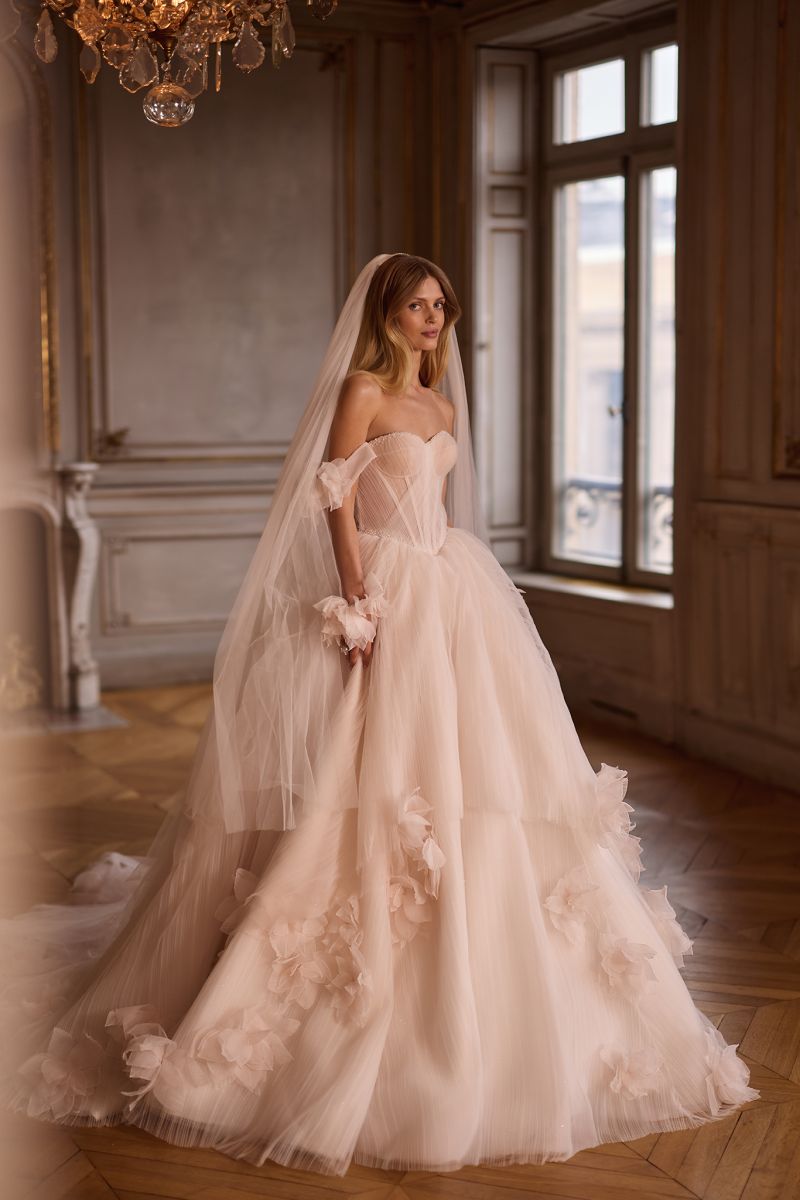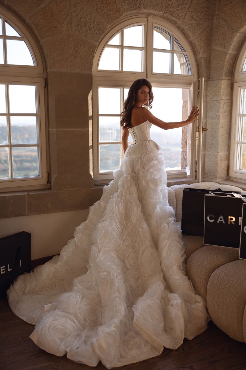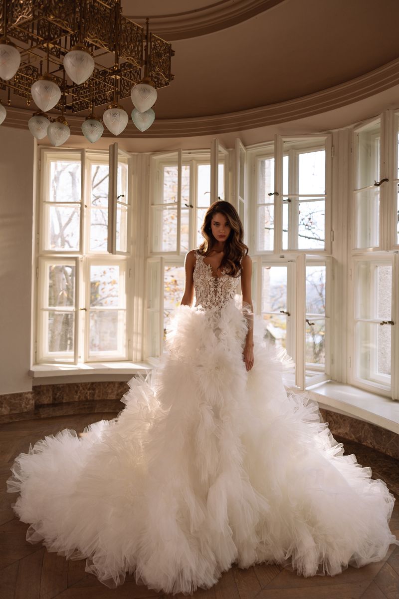 長拖尾澎裙以多層紗料堆疊,透過立裁精準建構裙身輪廓。