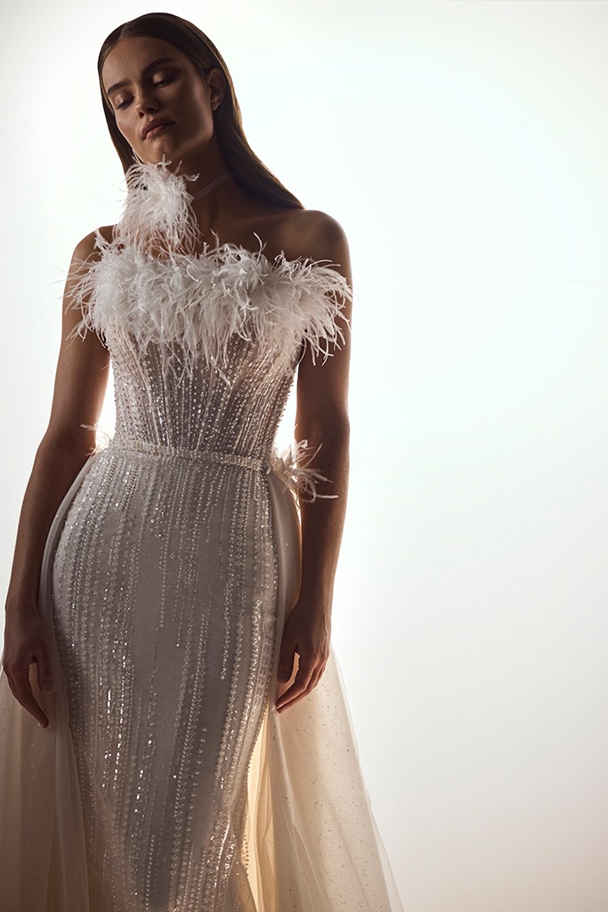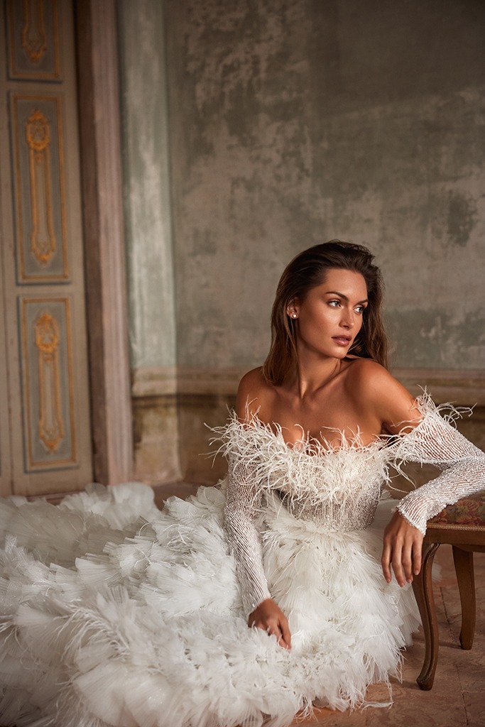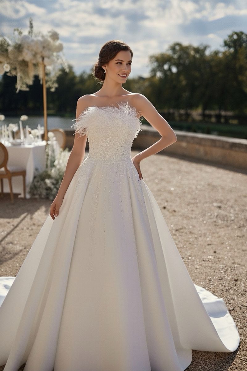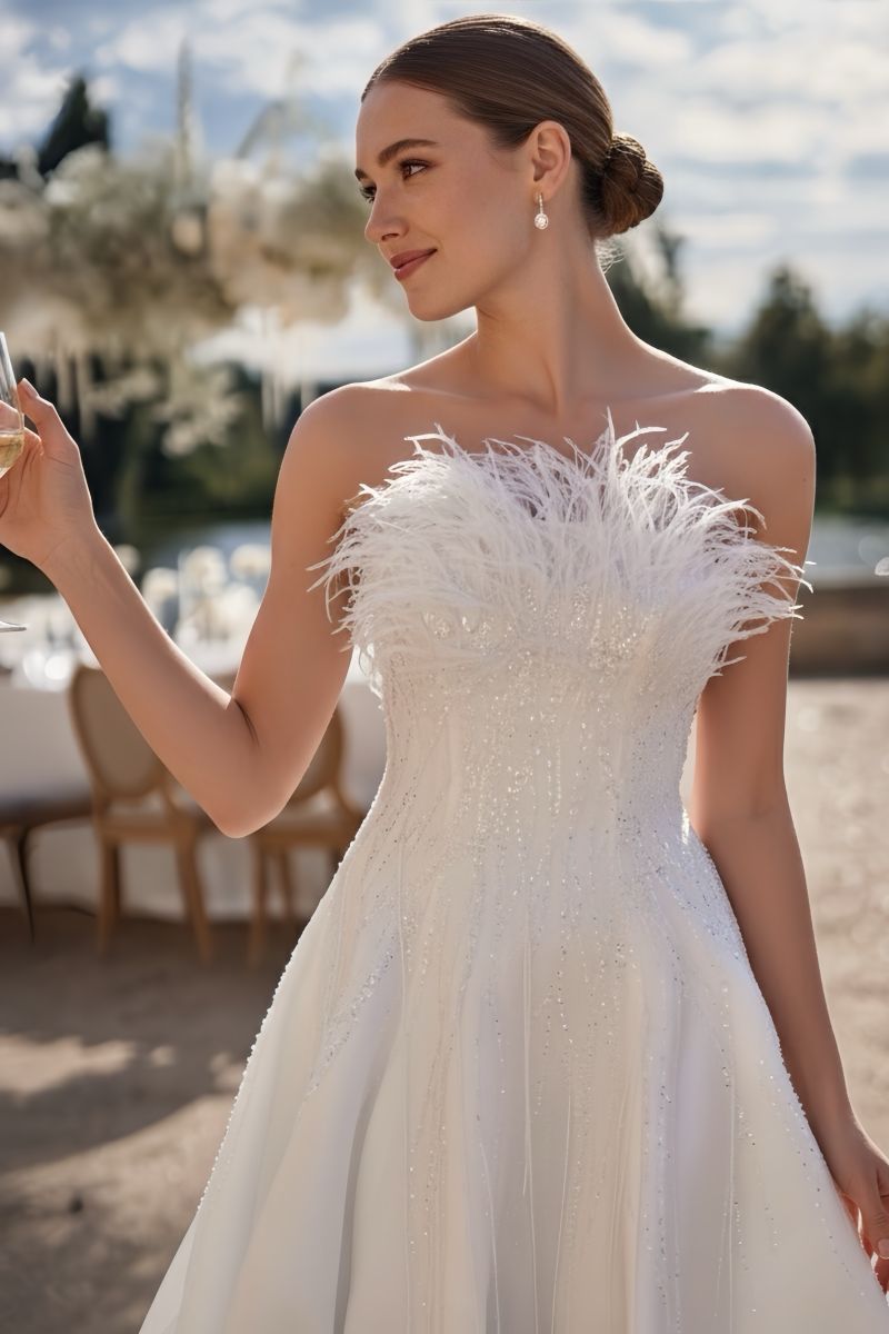 “珍珠光澤、公主腰線、蝴蝶結風潮、迷你婚紗、削肩魅力、羽毛元素”