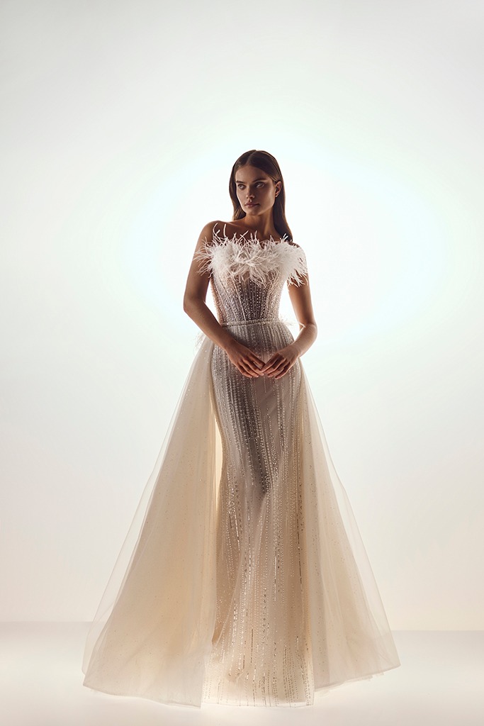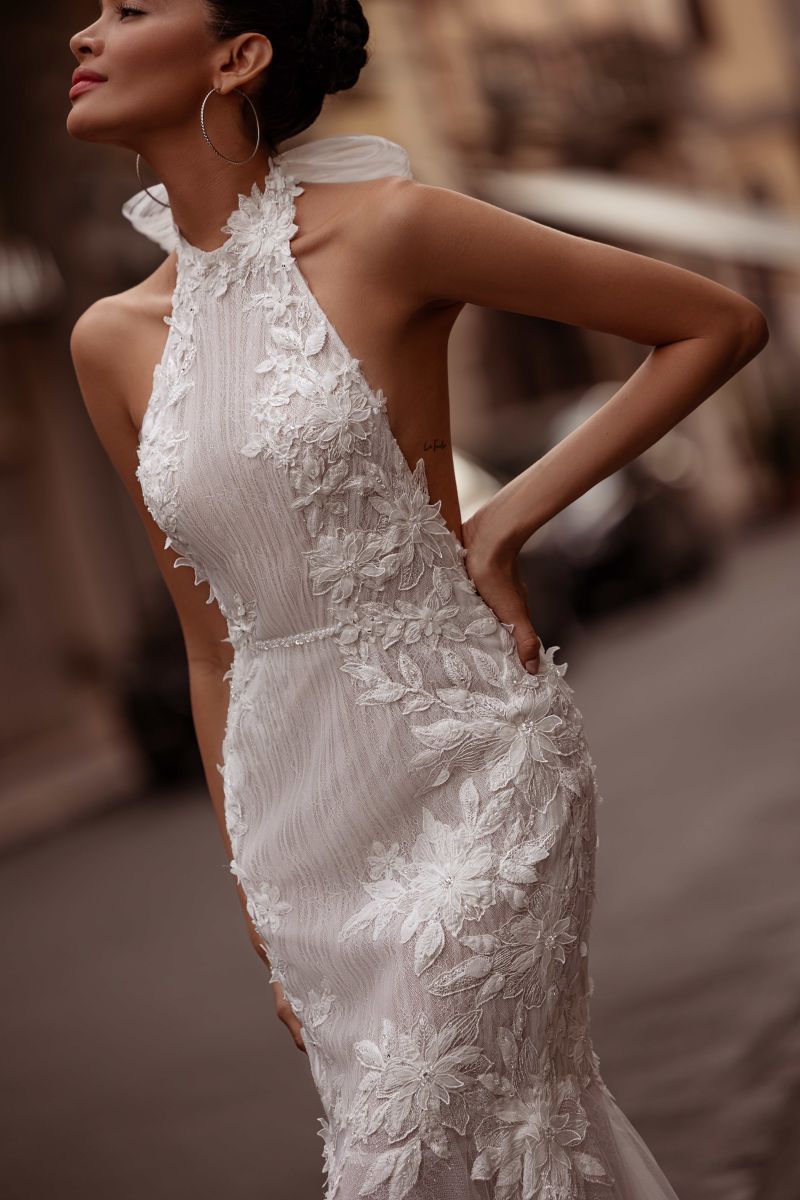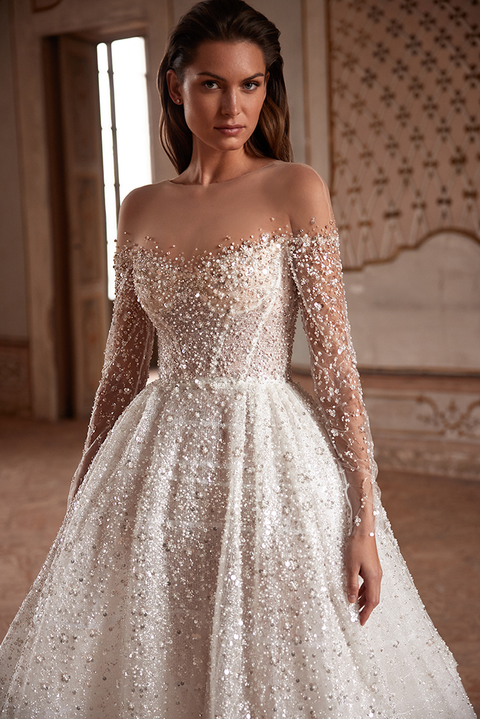 「微型珍珠」細緻鋪陳在婚紗上,讓布料自然呈現立體層次與細節感。
