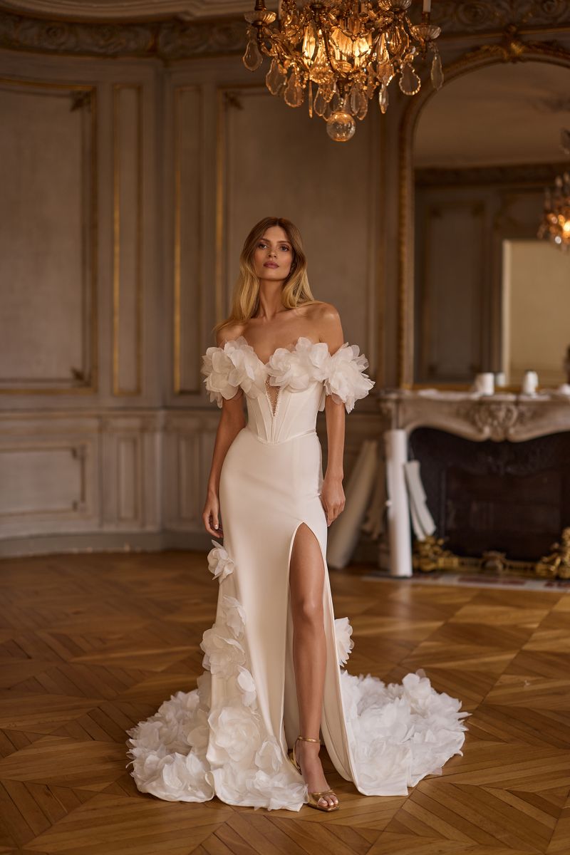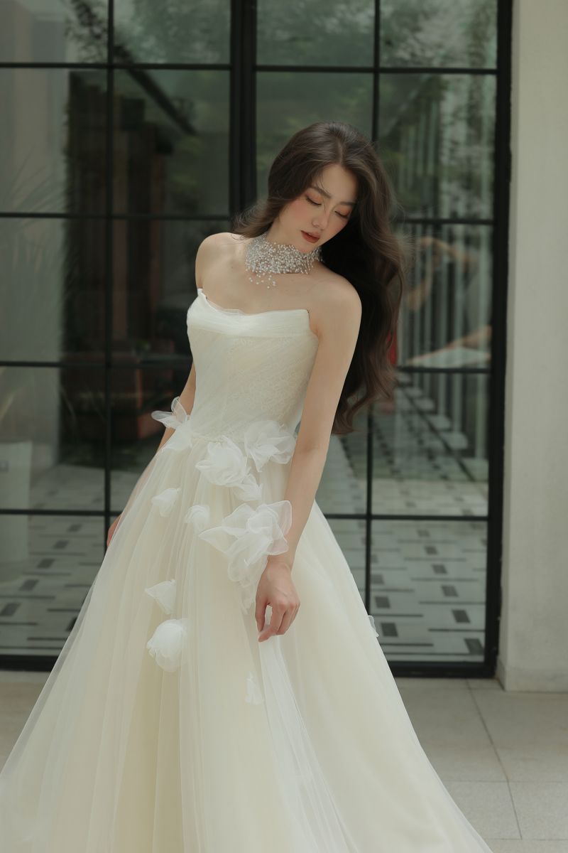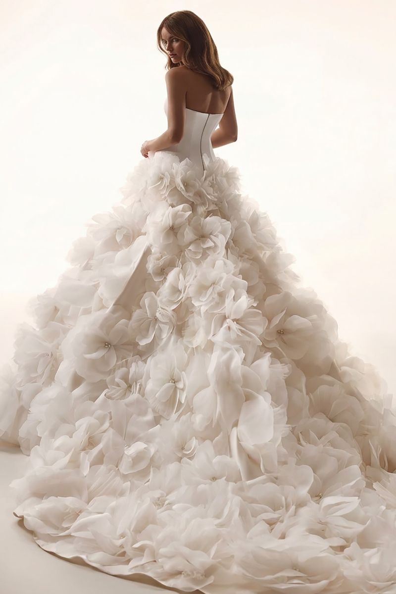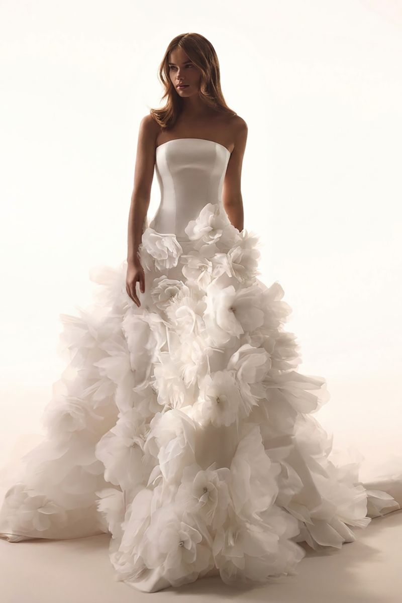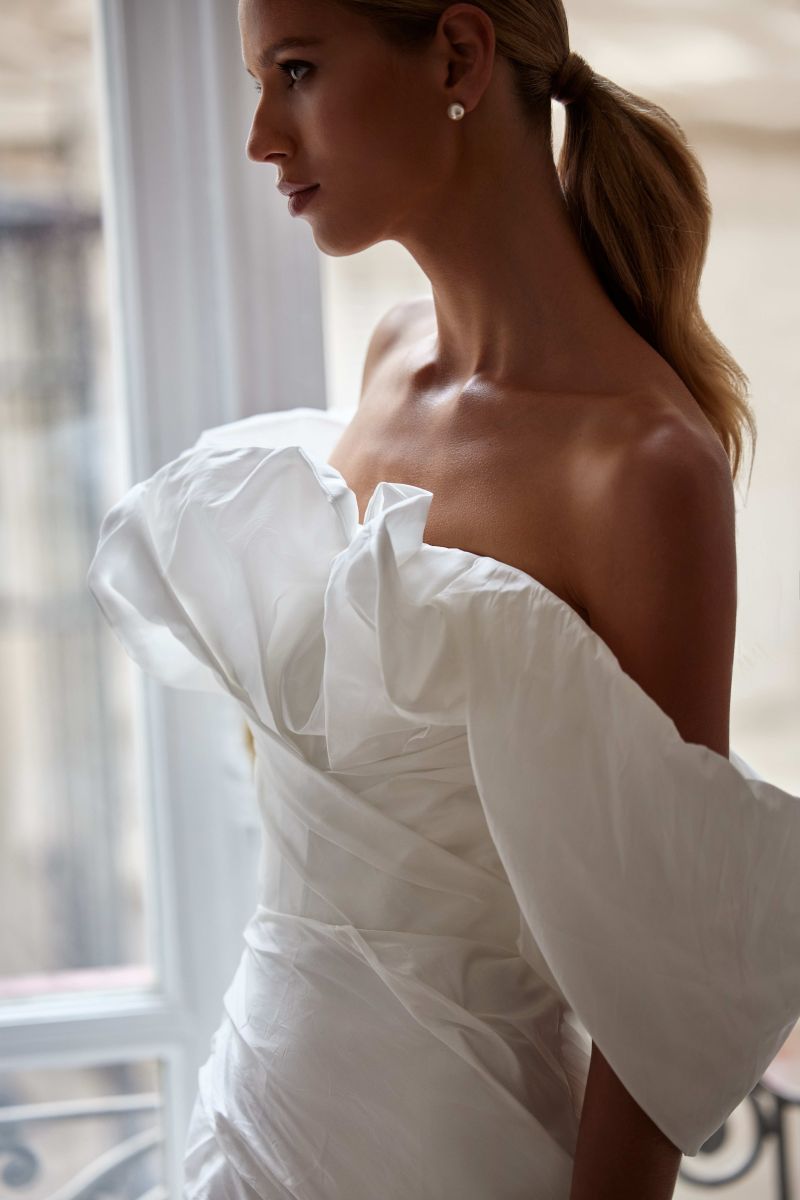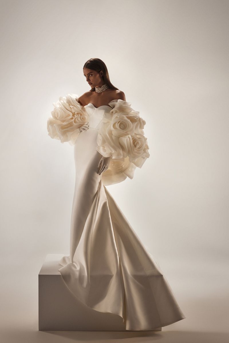 "柔和弧度、露肩長袖線條、氣勢披肩、立體花朵、層次堆疊、俐落平口、立體抓褶”
