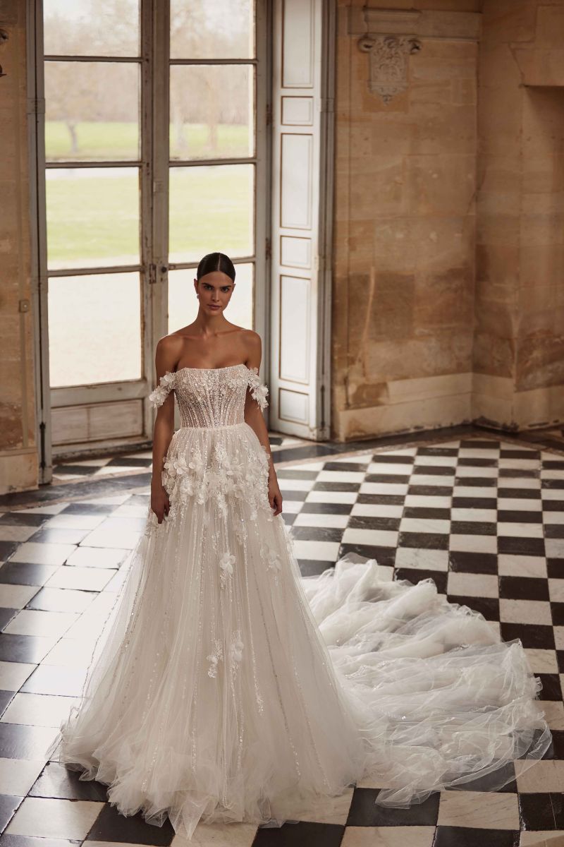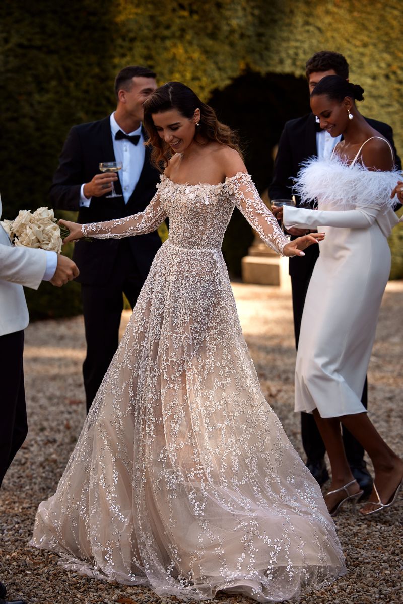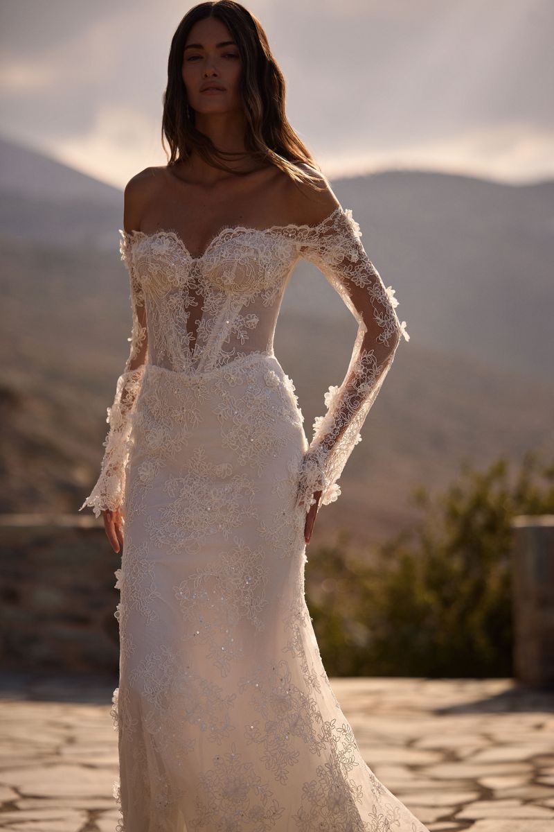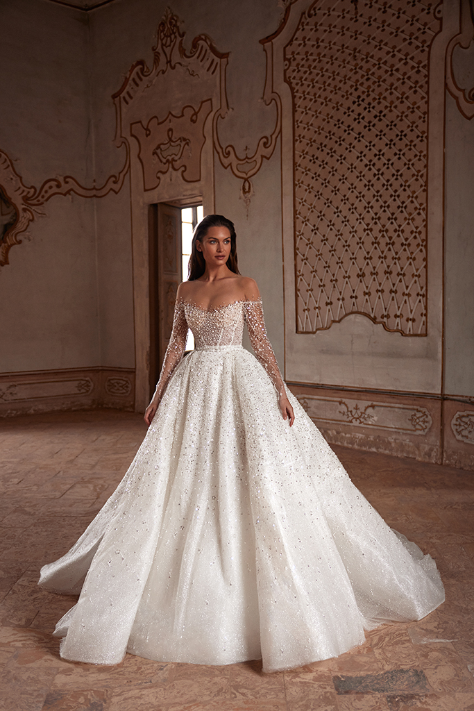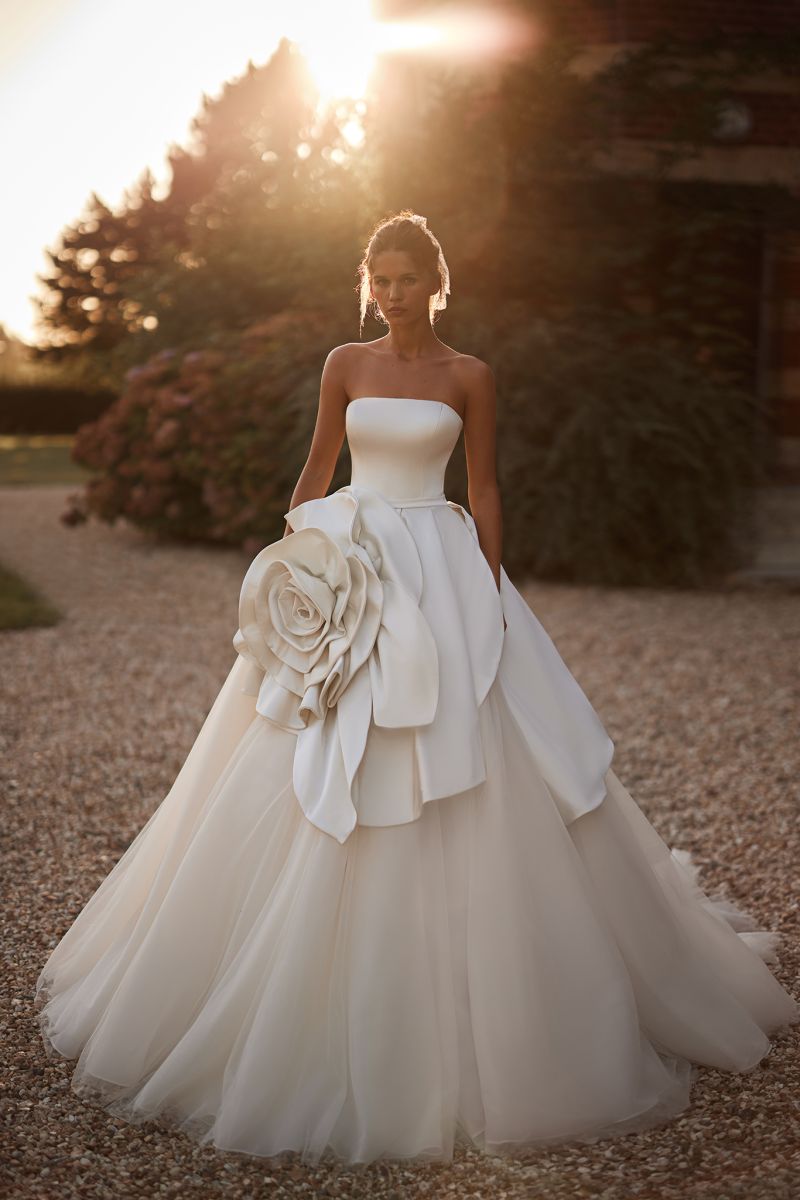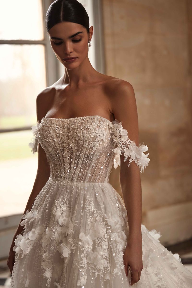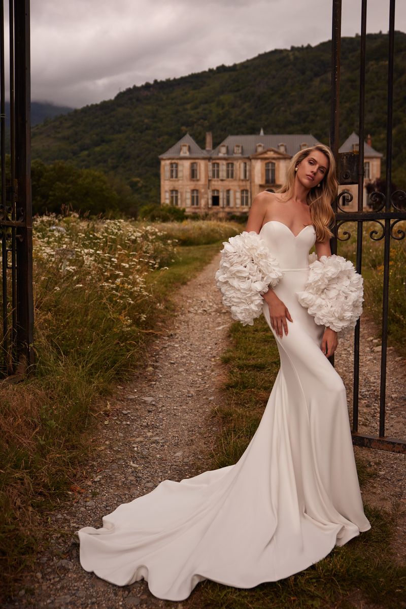 "柔和弧度、露肩長袖線條、氣勢披肩、立體花朵、層次堆疊、俐落平口、立體抓褶”
