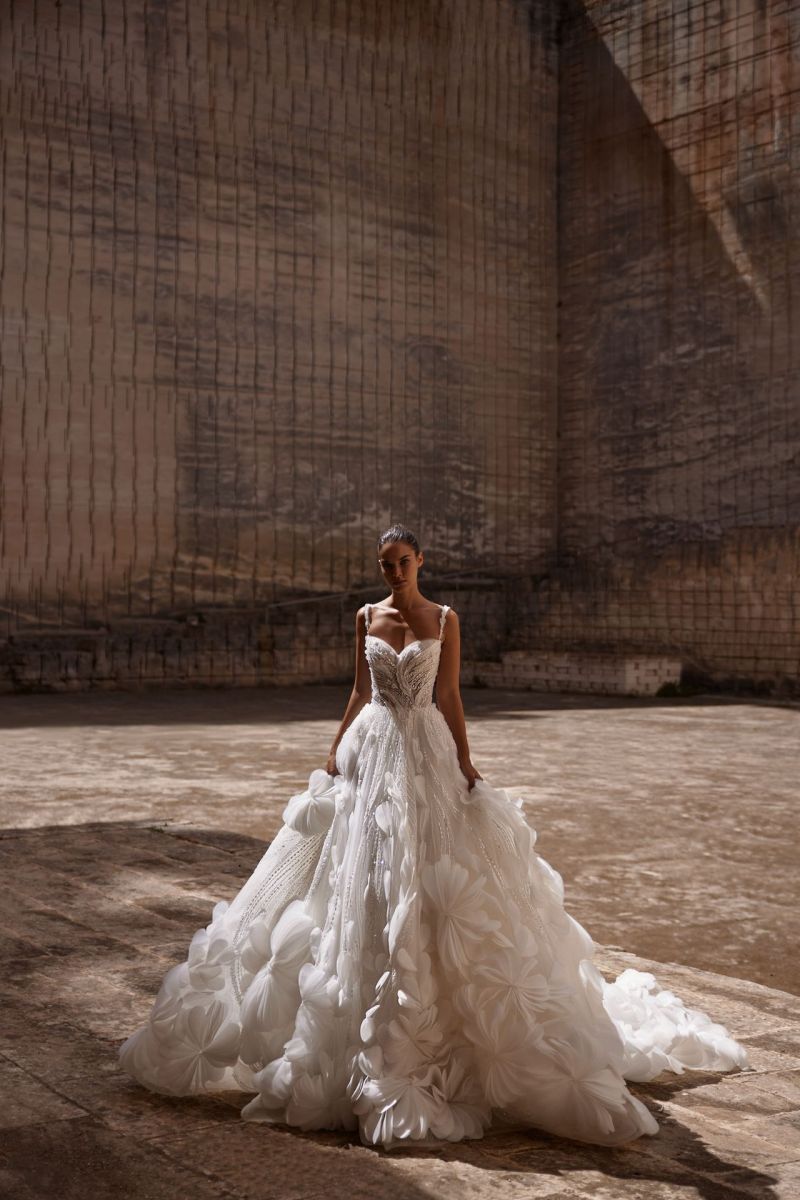 立體花元素透過剪裁與手工堆疊,從布料自然延伸。